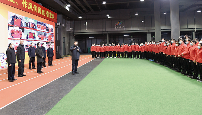 在速滑館一層,速滑運動員正在進行團體追逐訓(xùn)練。習(xí)近平仔細觀看,并向參訓(xùn)運動員、教練員表示慰問,勉勵他們科學(xué)備戰(zhàn)、奮勇拼搏、爭創(chuàng)佳績。隨后,習(xí)近平前往速滑館地下一層,參觀“帶動三億人參與冰雪運動成果展”,了解我國冰雪運動發(fā)展情況。習(xí)近平指出,這些年,在各方面共同努力下,越來越多的人愛上了冰雪運動,提前實現(xiàn)了“帶動3億人參與冰雪運動”的目標。建設(shè)體育強國、健康中國,最根本的是增強人民體質(zhì)、保障人民健康。這是全面建設(shè)社會主義現(xiàn)代化國家的一個重要方面。要充分利用舉辦北京冬奧會、冬殘奧會形成的熱潮,堅持競技體育和群眾體育一體推進,推動我國冰雪運動持續(xù)發(fā)展。