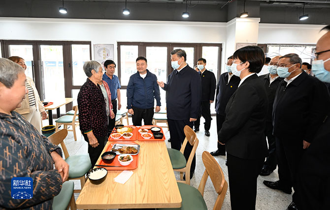 5月10日,中共中央總書(shū)記、國(guó)家主席、中央軍委主席習(xí)近平在河北省雄安新區(qū)考察,并主持召開(kāi)高標(biāo)準(zhǔn)高質(zhì)量推進(jìn)雄安新區(qū)建設(shè)座談會(huì)。這是10日上午,習(xí)近平在容東片區(qū)南文營(yíng)社區(qū)食堂同就餐的社區(qū)老人親切交流。(新華社記者 李學(xué)仁 攝)