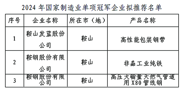 按照《工業和信息化部辦公廳關于開展2024年制造業單項冠軍企業遴選認定和復核評價工作的通知》(工信廳政法函〔2024〕328號)要求,鞍鋼集團有限公司組織開展了2024年制造業單項冠軍企業推薦申報工作,已完成初步論證,現將擬推薦名單予以公示(詳見附件),公示結束后將推薦至工業和信息化部。