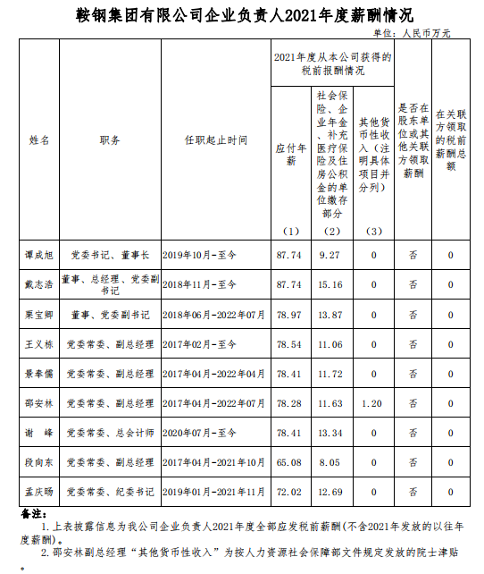 鞍鋼集團有限公司企業負責人2021年度薪酬情況